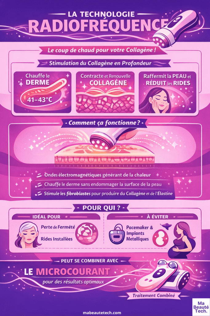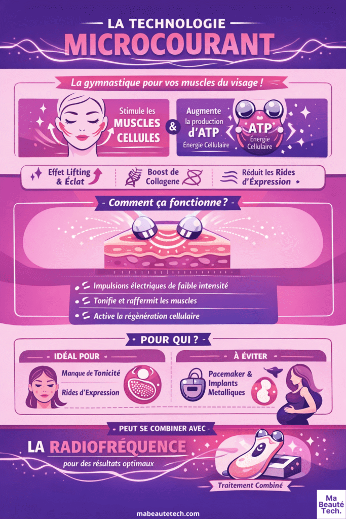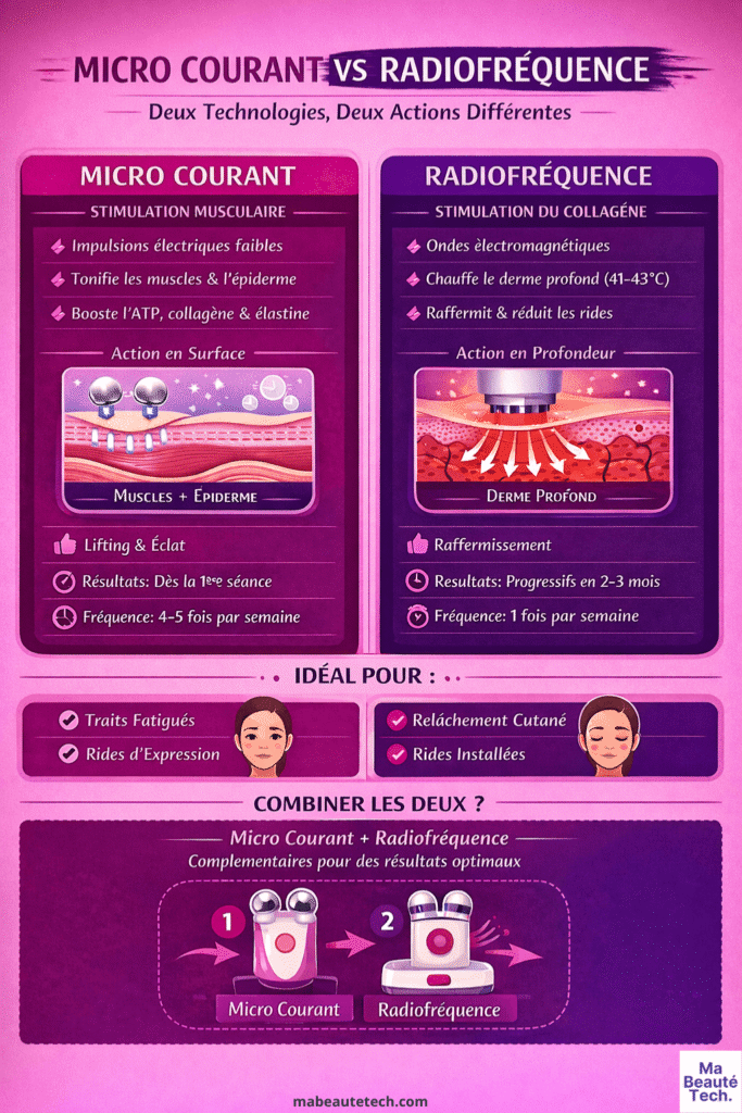 👉 Pour schématiser : le micro courant, c’est une salle de sport pour vos muscles faciaux. La radiofréquence, c’est un réveil-matin pour vos fibroblastes. Les deux rajeunissent la peau, mais par des chemins biologiques très différents, et c’est précisément pourquoi elles sont complémentaires plutôt que substituables.